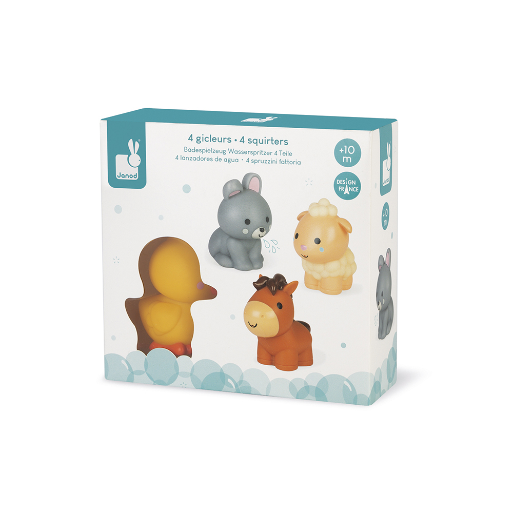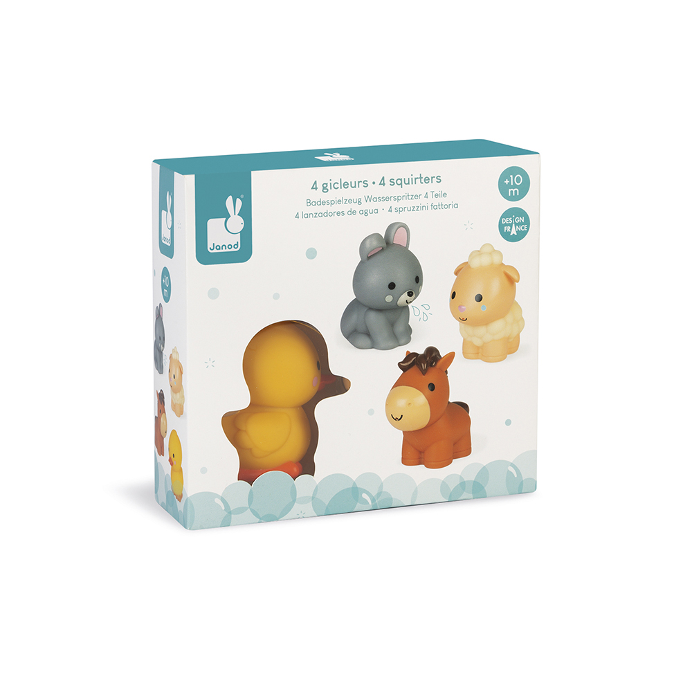 Voor kinderen van 10 maanden en ouder 4 boerderijdieren: een paard, een eend, een schaap en een konijn. Gemakkelijk om vast te nemen, voor uren speelplezier in bad!