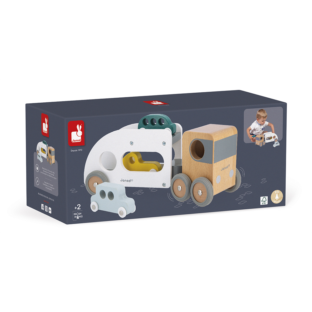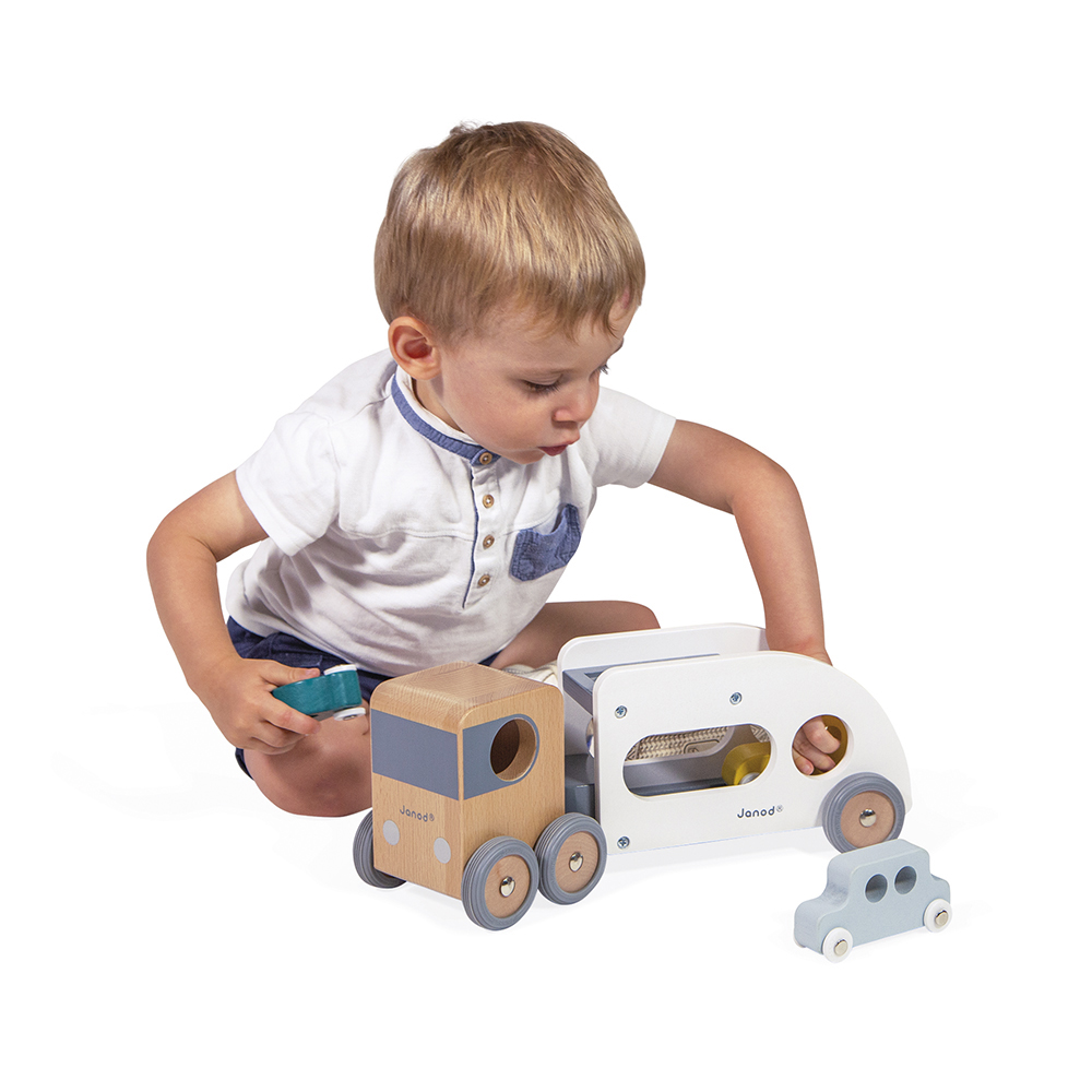 Speciale levering!! Deze grote houten transportwagen, met afneembare aanhangwagen, kan 3 auto’s tegelijkertijd leveren. Hij kan overal langs dankzij zijn belangrijke draaihoek. De vrachtwagen beschikt over perfect stille, rubberen wielen. incl. 3 auto’s. Ontwikkelt de fijne motoriek en verbeelding van uw kind. Speelgoed van massief FSC TM hout en waterverf. Ontwikkelingsspeelgoed voor kinderen vanaf 2 jaar.