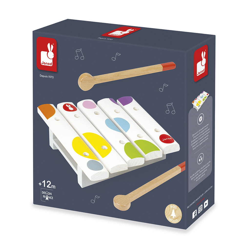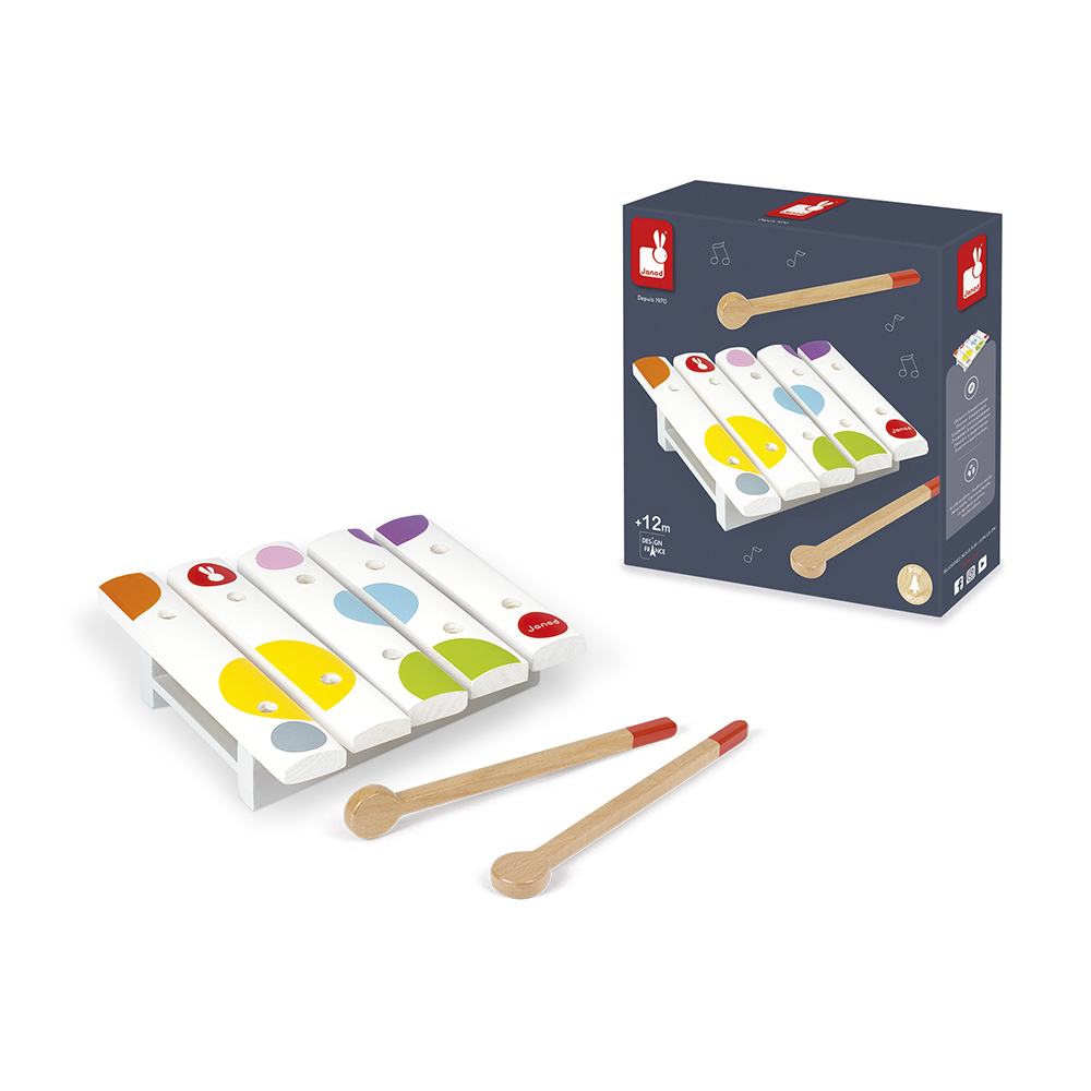 Mini houten xylofoon van de serie Confetti met 5 tonen, 2 stokjes. Geschikt voor peuters vanaf 12 maanden.