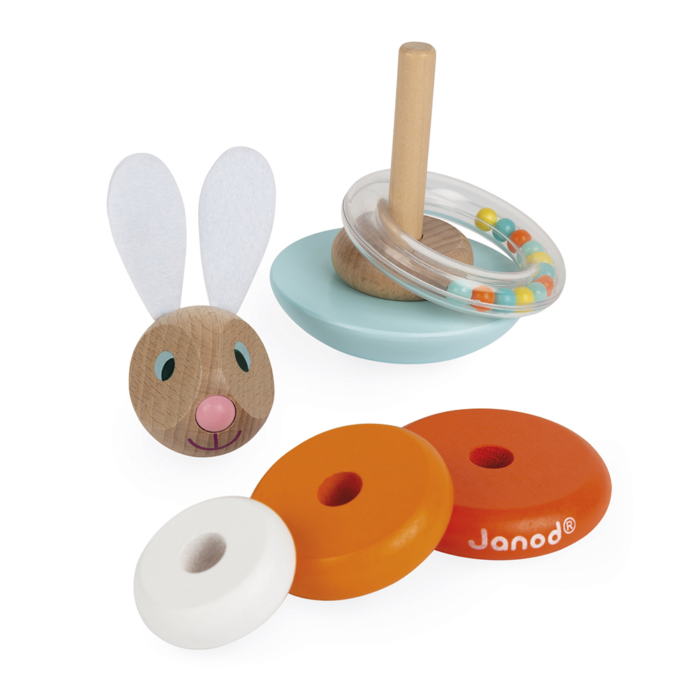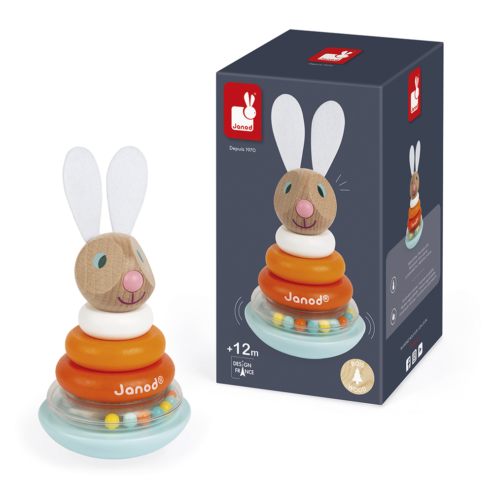 Een opnieuw samen te stellen konijn door de verschillende houten onderdelen te stapelen om een leuke Culbuto te bekomen. Een ring met gekleurde knikkers die vrolijk klinken terwijl het konijn beweegt! De oren zijn in vilt voor een superzacht gevoel!