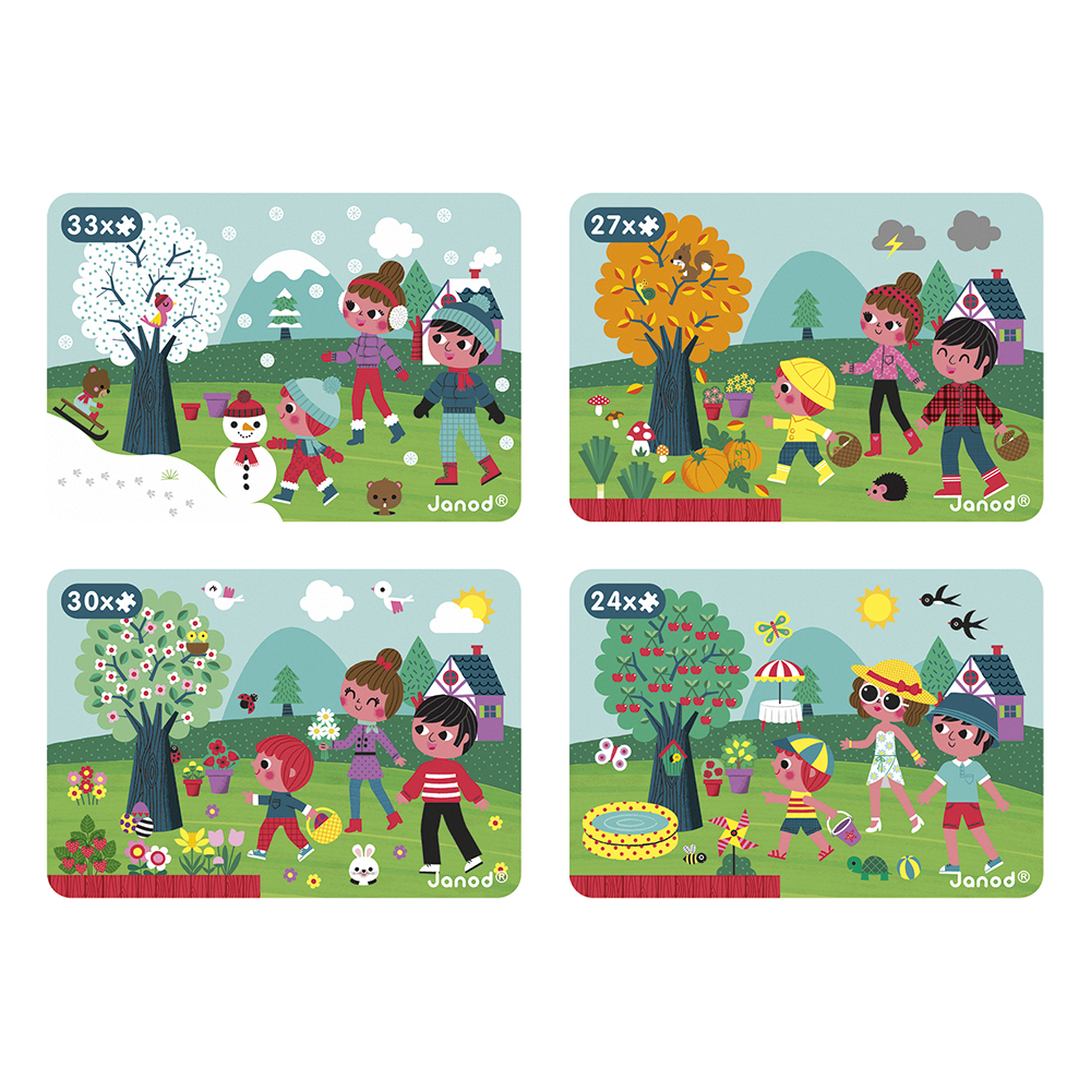 Educatief magneetspel van karton met de seizoenen als thema. Bevat 115 magneten en 4 kaarten. Open het boek en maak hetzelfde tafereel als deze die op de kaart is aangegeven met behulp van de magneten.