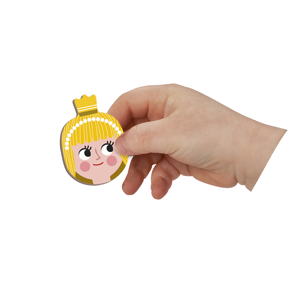 Educatief magneetspel van karton met sprookjes als thema, bestaande uit 30 magneten en 10 kaarten. Open het boek en maak hetzelfde sprookjesfiguur op de magnetische achtergrond als deze die op de kaart is aangegeven met behulp van de magneten. Het kind kan zich tevens vermaken met het mengen van verschillende stukken om gekke figuren te creëren, gezien alle stukken onderling verwisselbaar zijn.