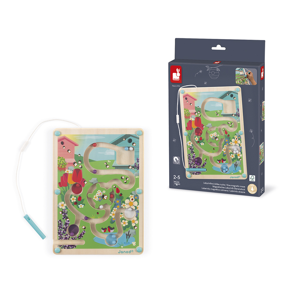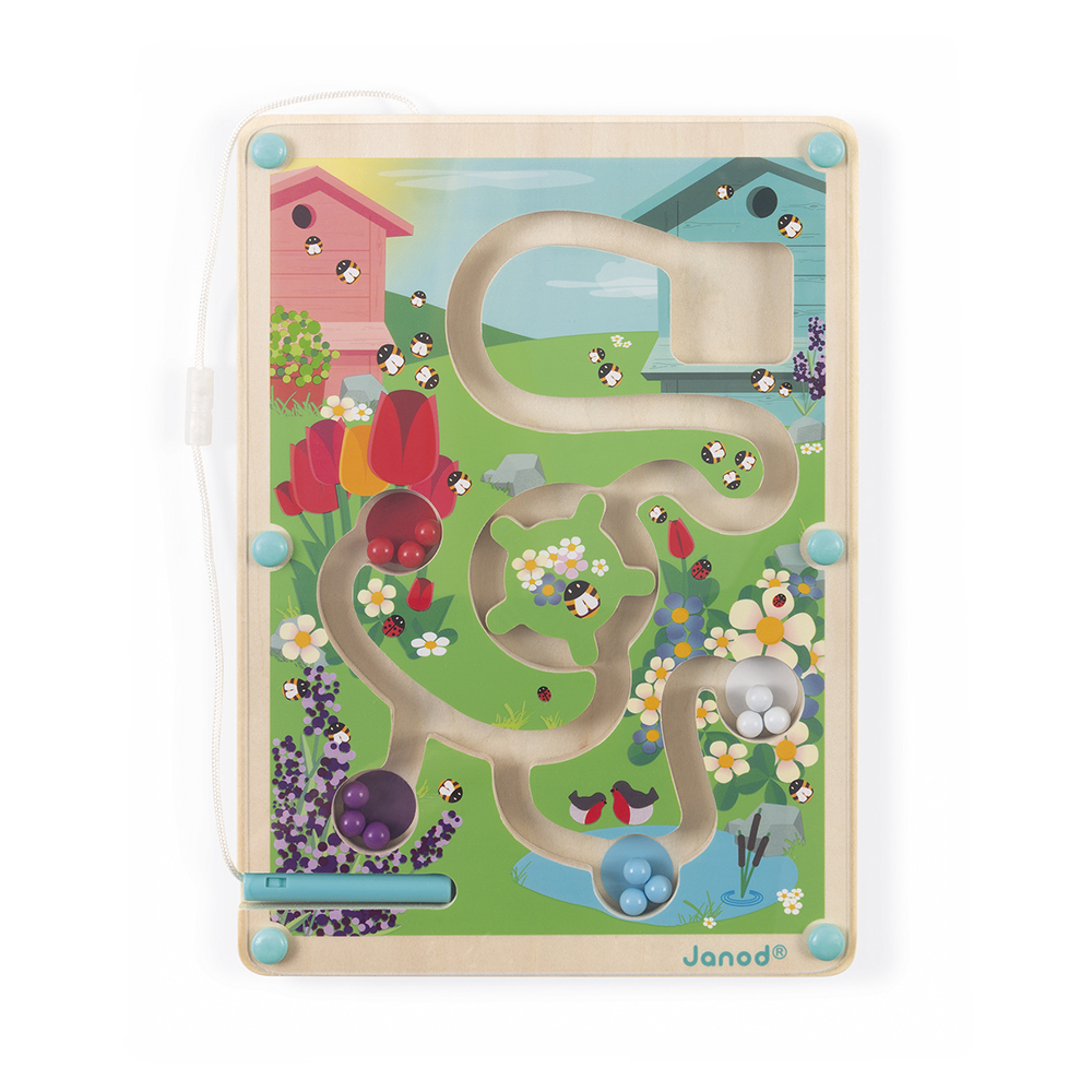 Ga vanaf de bijenkorf door het doolhof en breng de 12 gekleurde knikkers naar hun overeenkomstige zone met behulp van de magneetpen: blauw voor de plas, rood voor de tulpen, etc… Neem het draaihek echter goed zodat je niet vast komt te zitten!