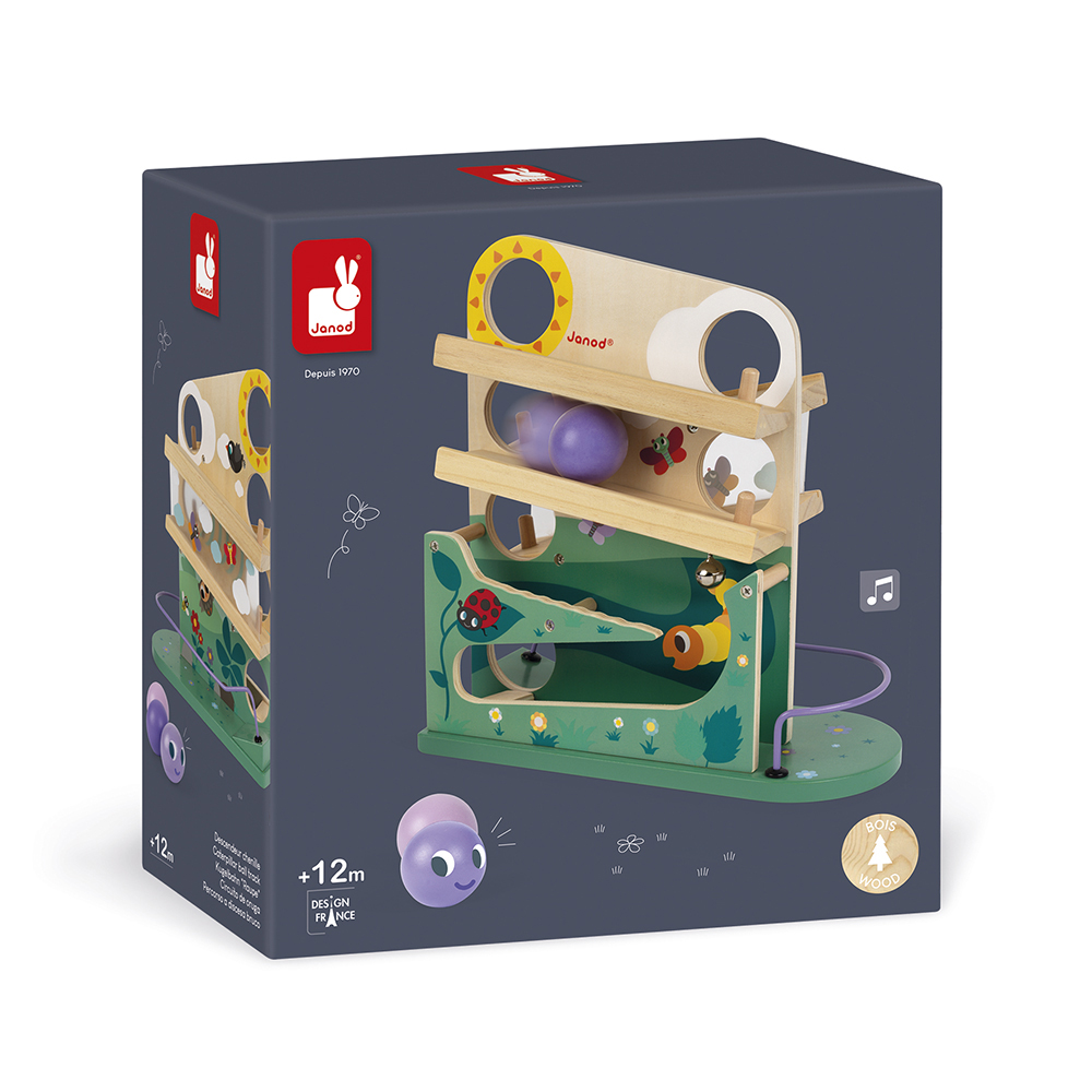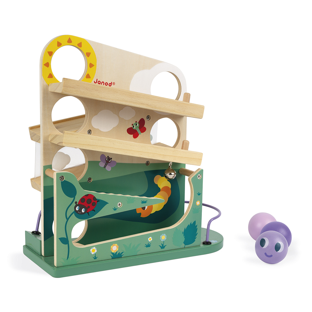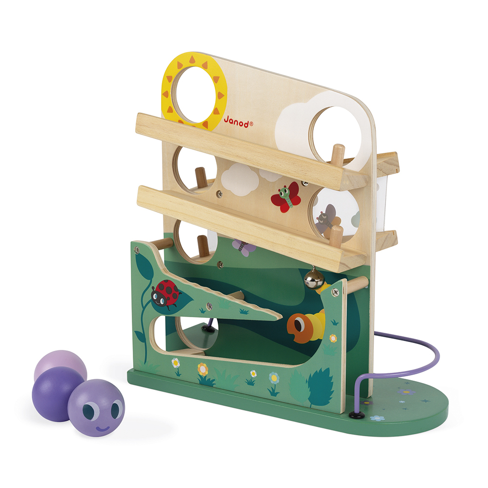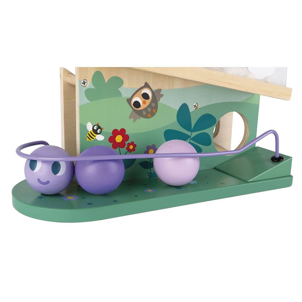 De 3 ballen gaan door de zon en de wolken, vervolgens door de transparante tunnel, laten de klok luiden en gaan vervolgens in de tuin en vormen een rups. Uw kind ontwikkelt zijn/haar gezichtsscherpte door de beweging te volgen. Geschikt voor kinderen van 1-3 jaar.