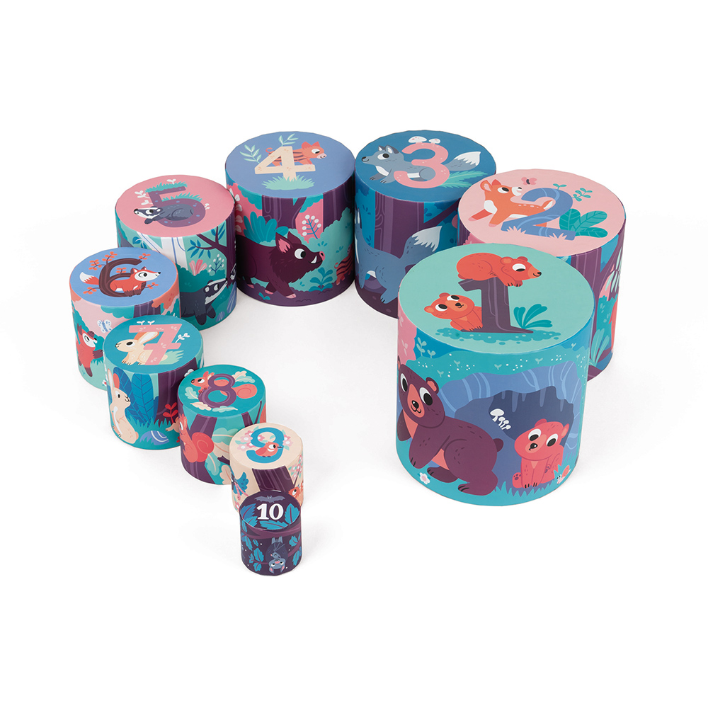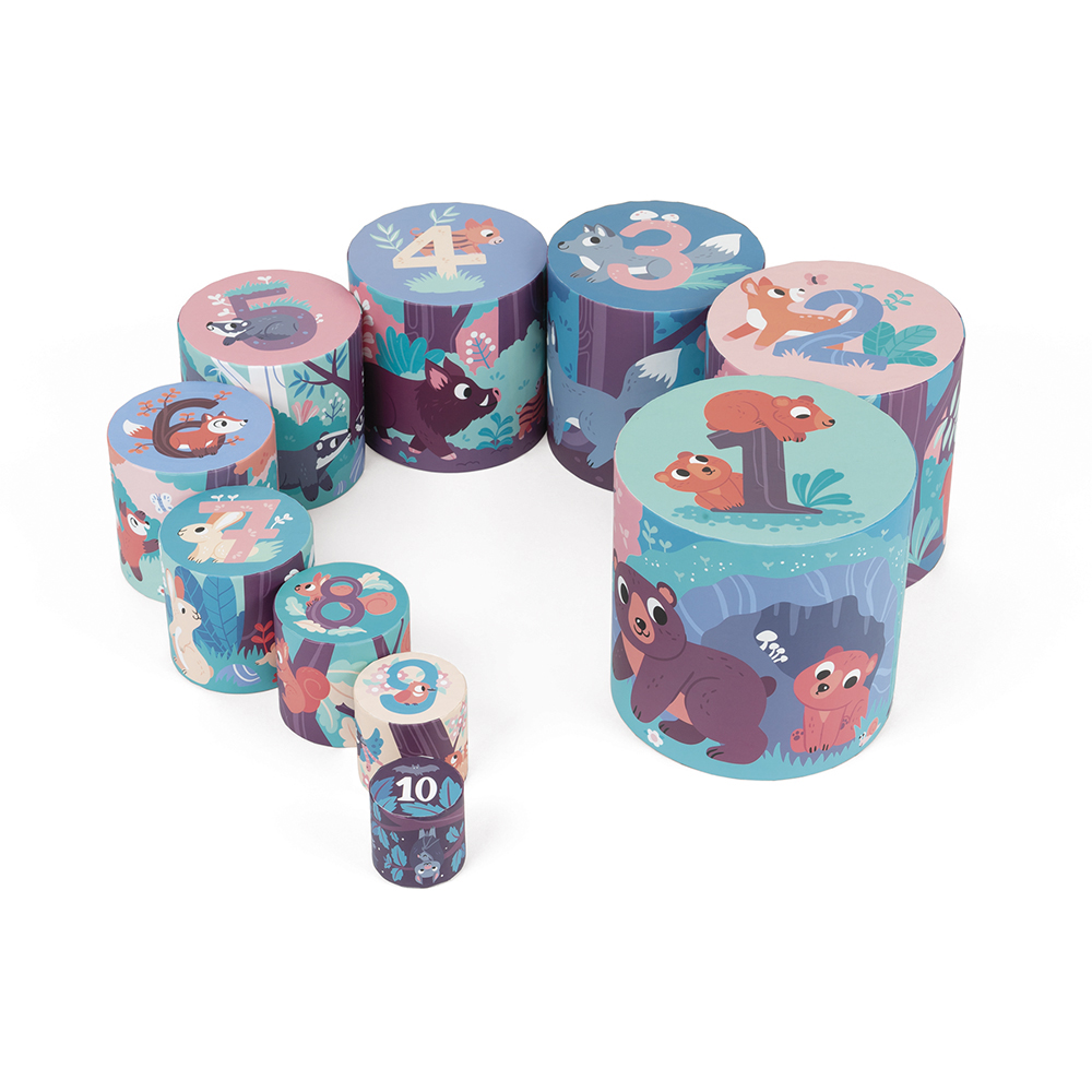 Kartonnen stapeltoren met 10 te stapelen elementen om een schitterende piramide te bouwen in het thema van de dieren uit het bos. Op de bovenkant van elk element bevindt zich een cijfer. Met deze piramide leert uw kind tot 10 tellen en ontwikkelt hij zijn motoriek en verbeeldingskracht op een leuke manier!