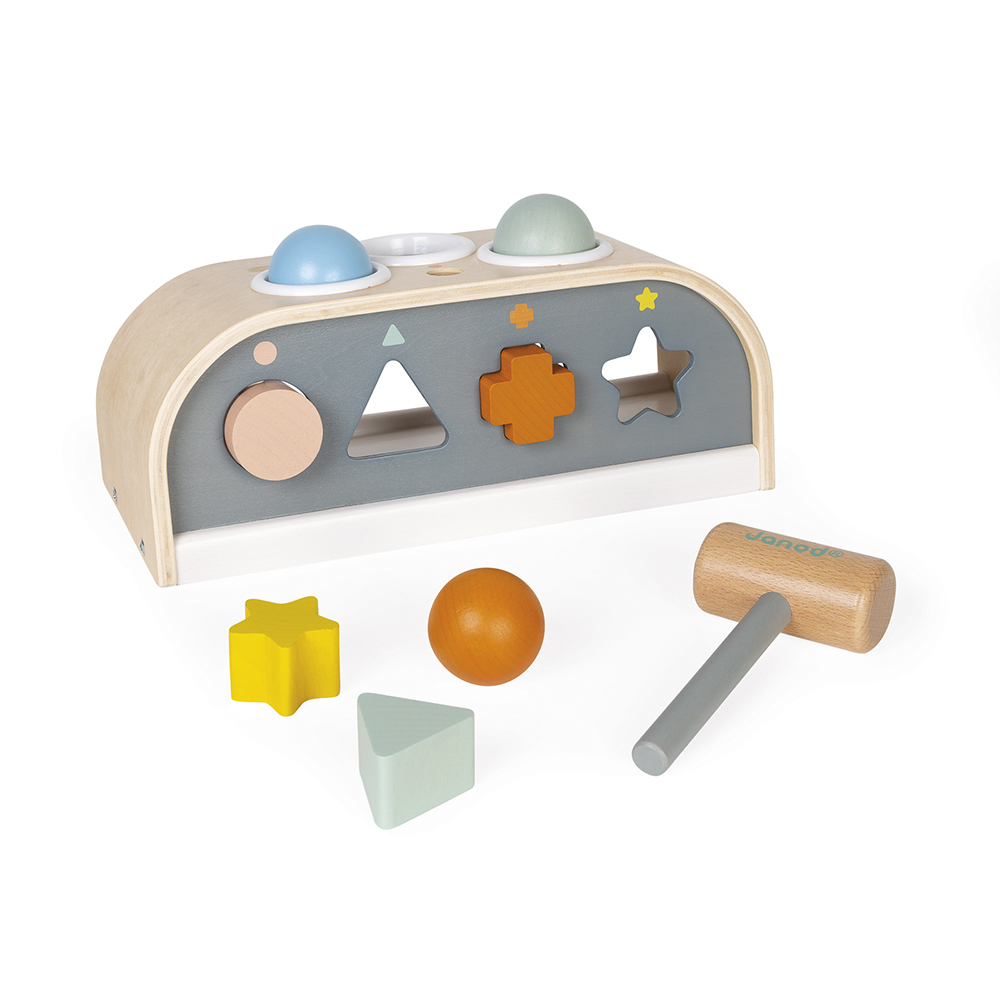 Behendigheidsspel waarmee uw kind al spelenderwijs zijn/haar behendigheid en coördinatie kan ontwikkelen. 3 activiteiten in 1: sla op de 3 ballen met de hamer, herken de 4 vormen en leer de kleuren kennen dankzij de insteekpuzzel en de vormendoos.