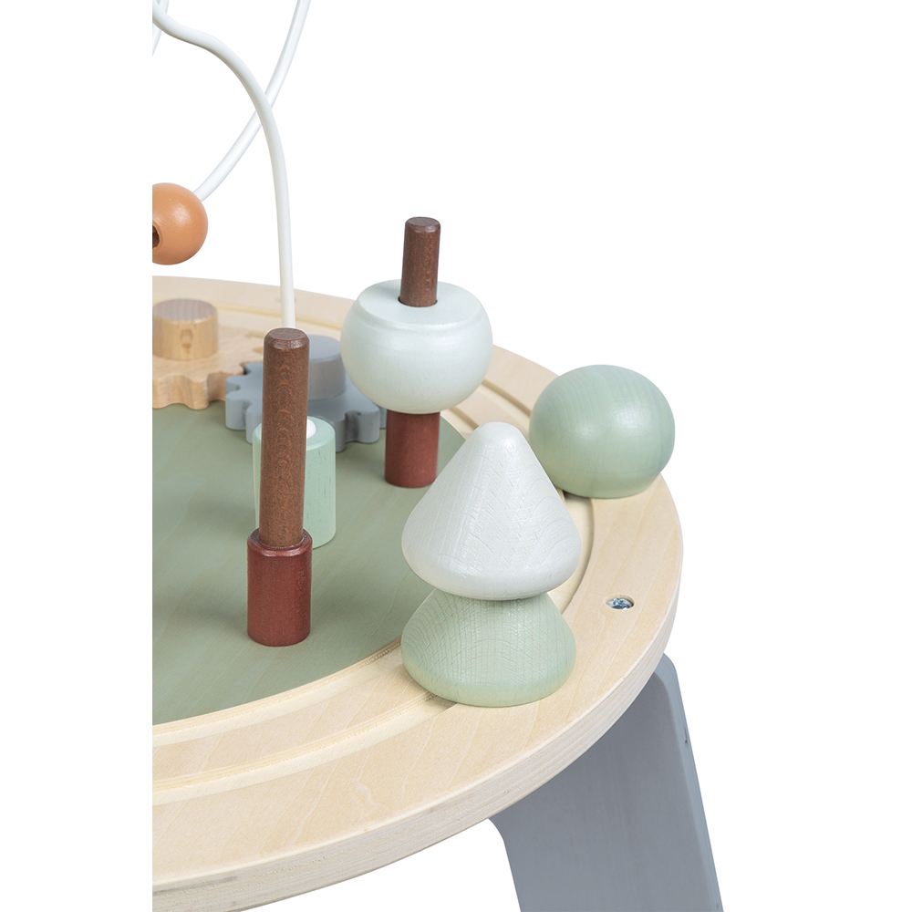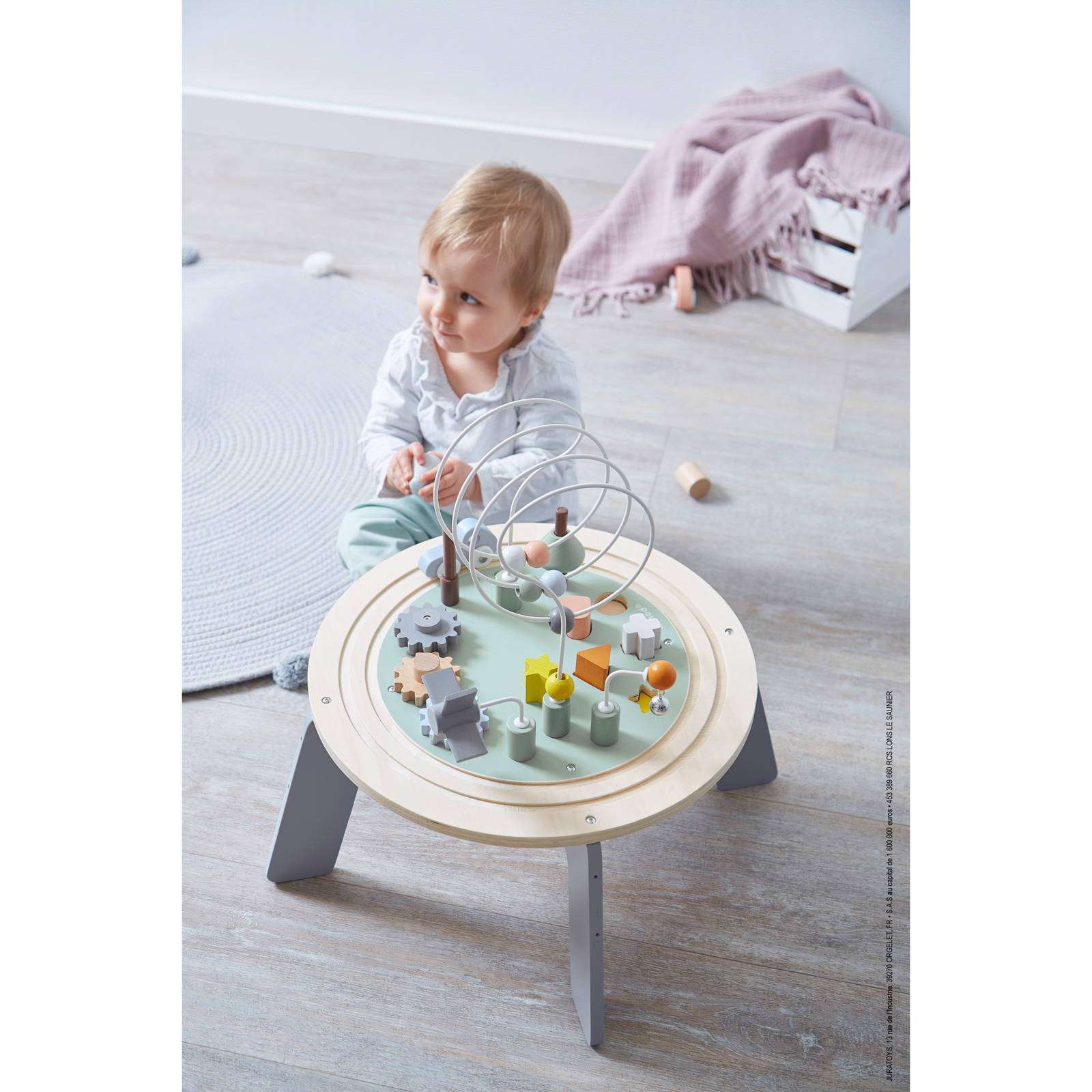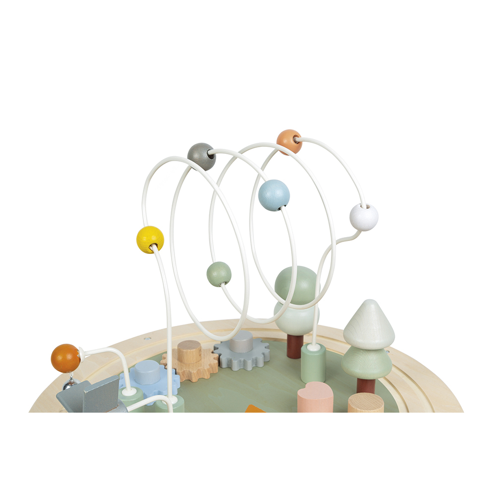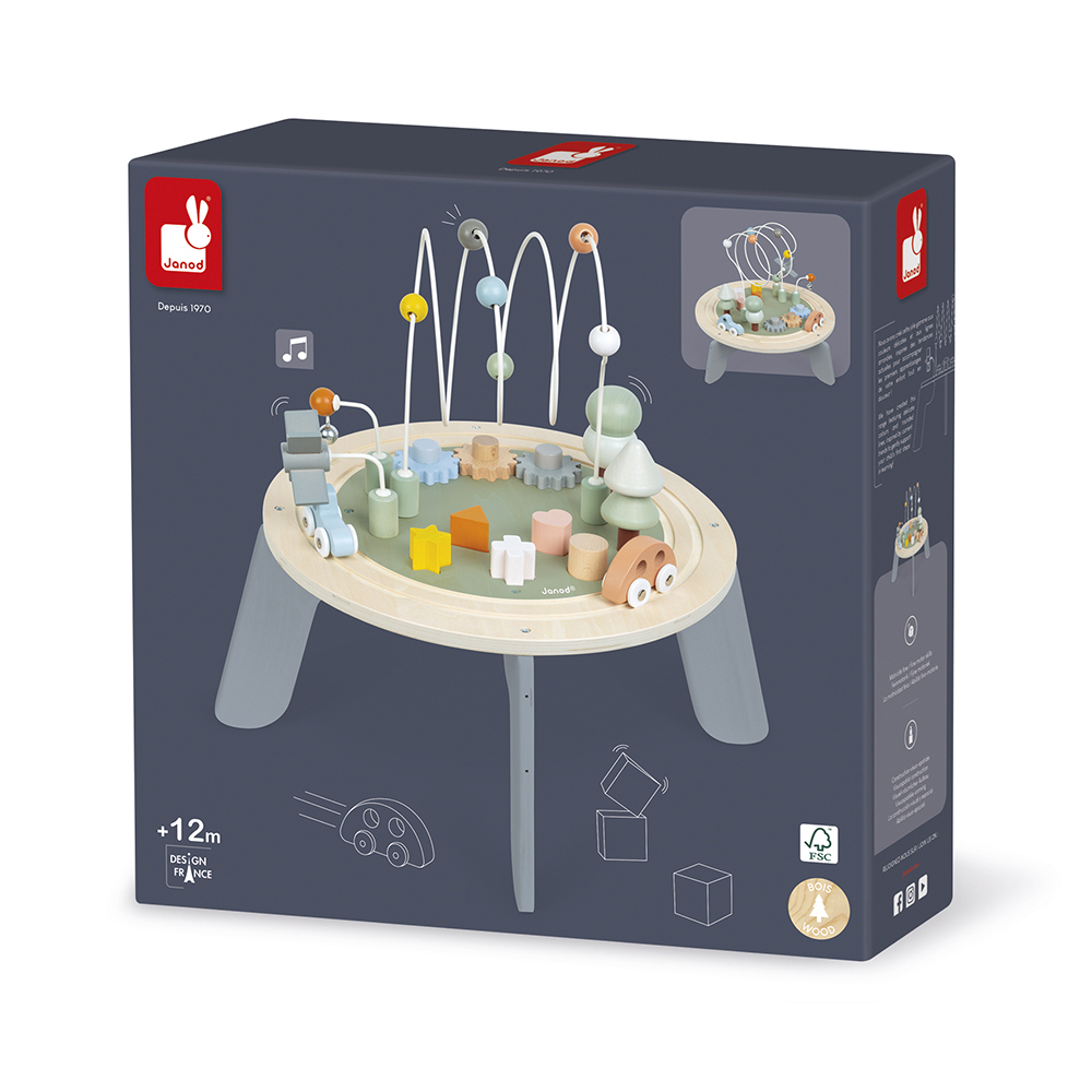 Deze speeltafel heeft veel activiteiten voor de allerkleinsten: – een cirkelvormig treinspoor met 2 voertuigen – 2 stapelbomen – 3 loopings met balletjes, molen en belletje – 3 tandwielen om te laten draaien – 5 inlegvormen In verscheidene zachte kleuren, geïnspireerd op de huidige trends om uw kind in alle rust te laten spelen! Grote stenen: 12 x 2,5 x 6 cm . Geschikt voor kinderen van 1 tot 3 jaar.